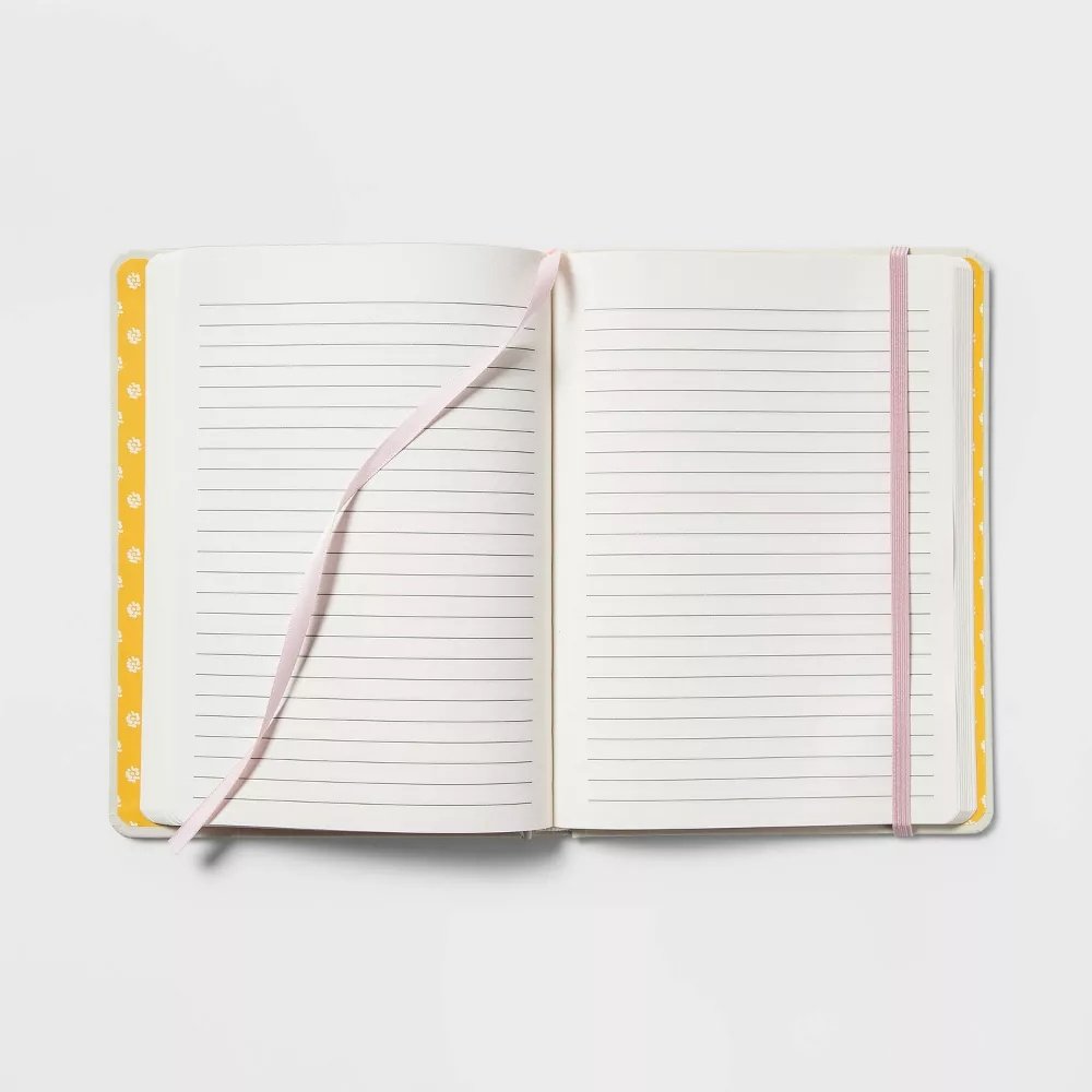 Add beautiful blooms to your assortment of school and office supplies with this College-Ruled Journal . This hardcover notebook has 240 double-sided, ruled pages for taking notes, making lists and more, along with a light pink ribbon bookmark and matching elastic band. Your daily note-taking is given a lively pop of color by the vibrant floral-print cover on a cream-colored background, which is elevated by the gold glitter heading that says “Notebook” on the front. Plus, the compact size makes it easy to carry around.