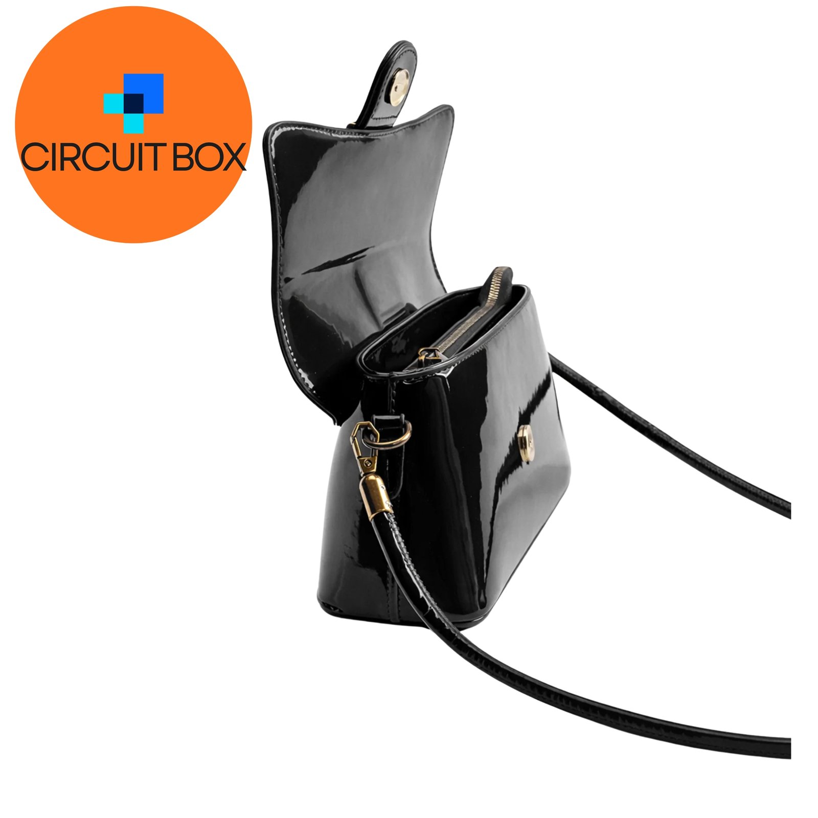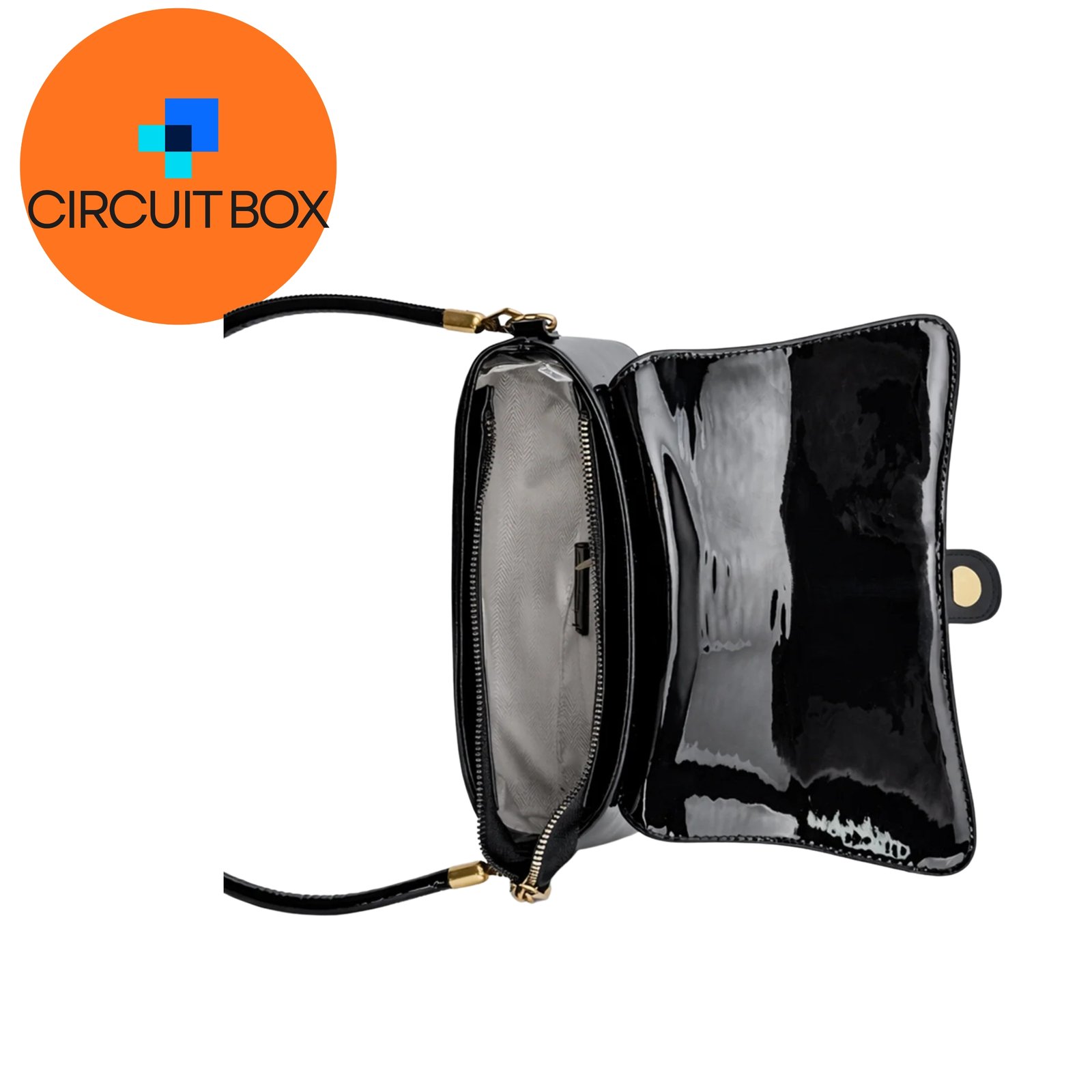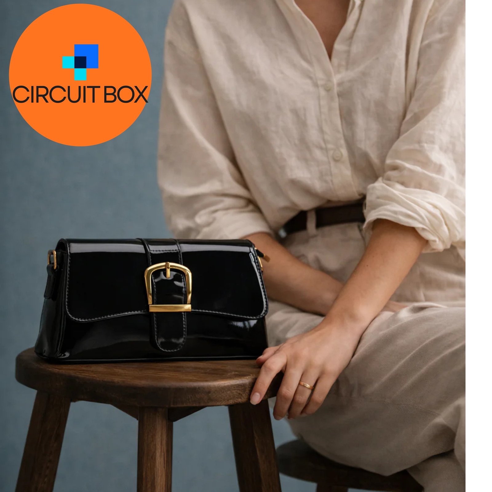 Circuitbox Black PU Clutch Bag with Strap – Adult Female, Patent Finish, Gold Buckle, Elegant & Compact (USA)